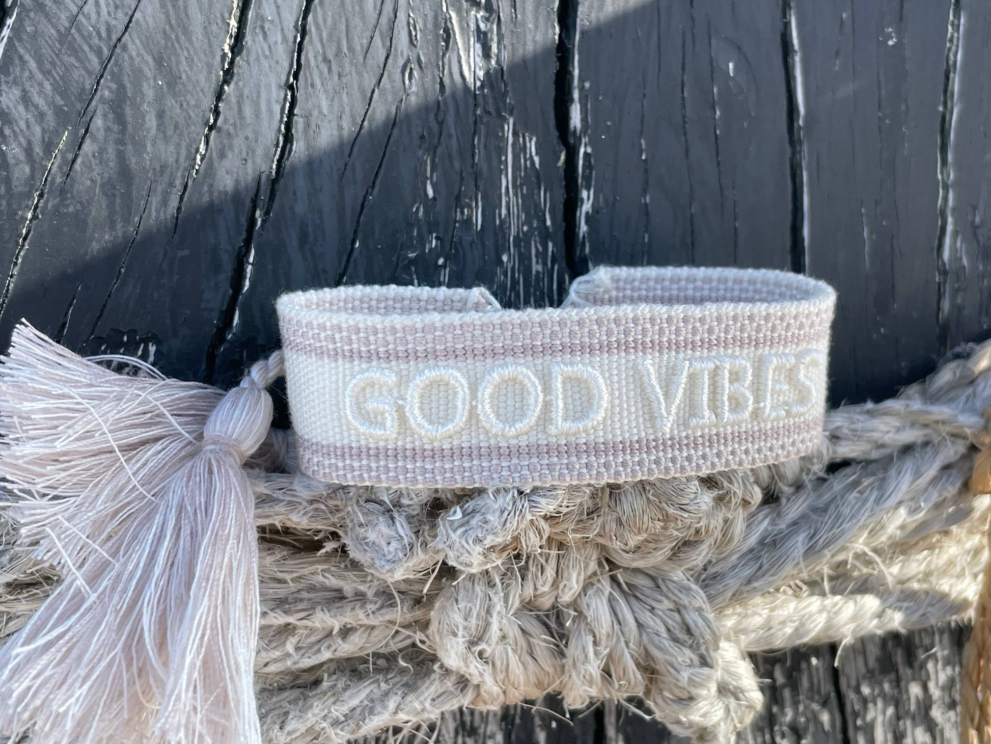 GOOD VIBES Armband: Ecru - Bordüre Light Taupe Text: Ecru