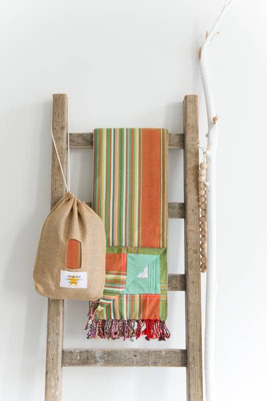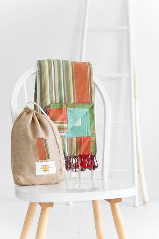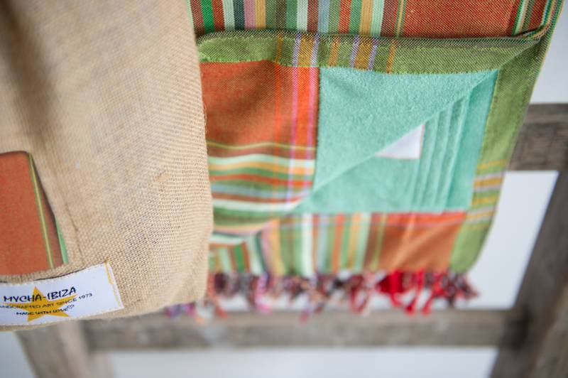 Stilvolles handgewebtes gestreiftes Cala Codolar Strandtuch aus Baumwolle und Frottee, 170x96 cm. Mit einer praktischen Aufbewahrungstasche und einer zusätzlichen eingenähten Tasche für all Ihre Wertsachen. Trendiges Ibiza-Strandtuch für Strand, Park, Yoga oder als schönes Tragetuch.