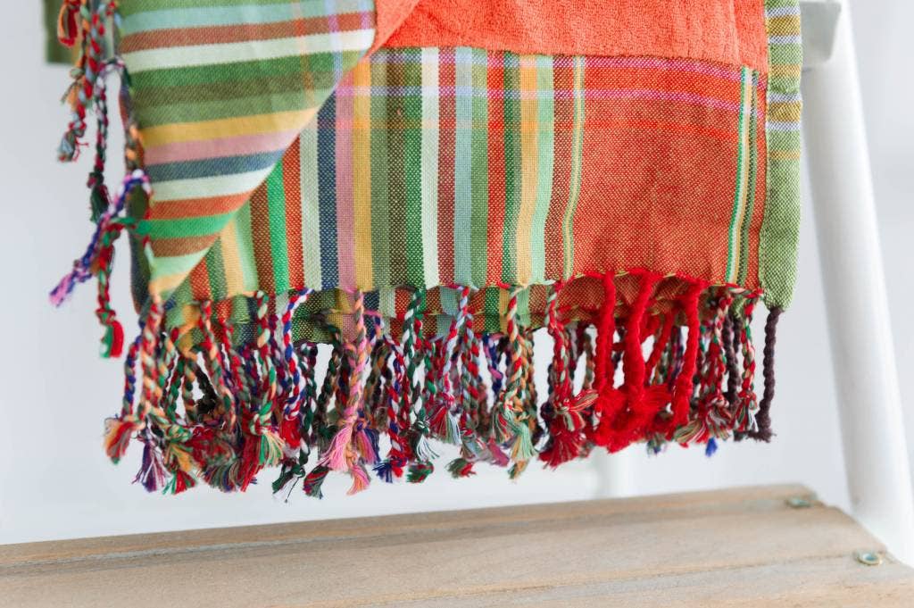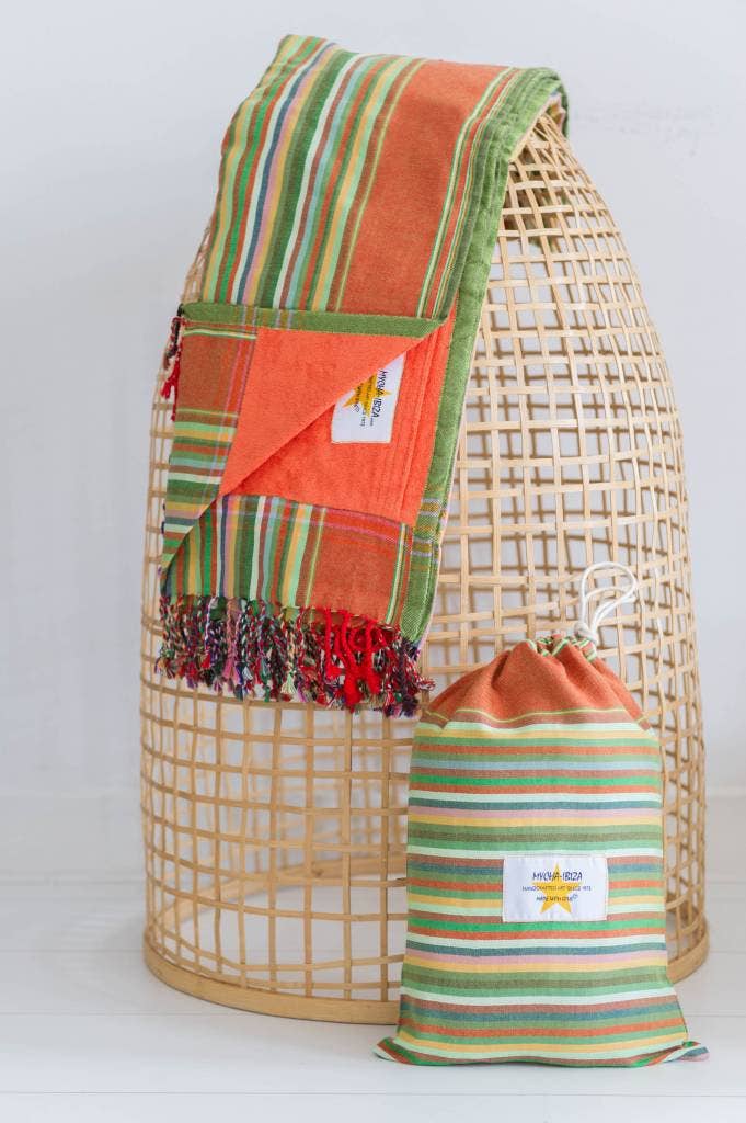 Stilvolles handgewebtes gestreiftes Strandtuch Cala Martina aus Baumwolle und Frottee, 170x96 cm. Mit einer praktischen Aufbewahrungstasche und einer zusätzlichen eingenähten Tasche für all Ihre Wertsachen. Trendiges Ibiza-Strandtuch für den Strand, Park, Yoga oder als schönes Wickeltuch.
